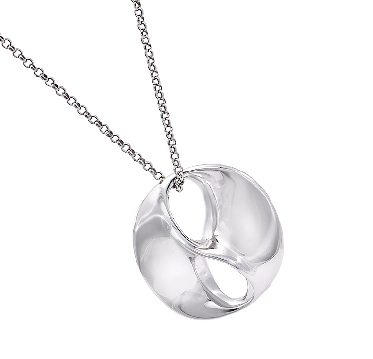 This beautiful statement sterling silver necklace is from the Love collection by Jorge Revilla. A highly polished mobius shape forms a very elegant pendant.