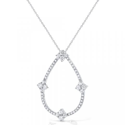 Diamonds set in gold dazzle in this open pear shape necklace accented with clover detail
